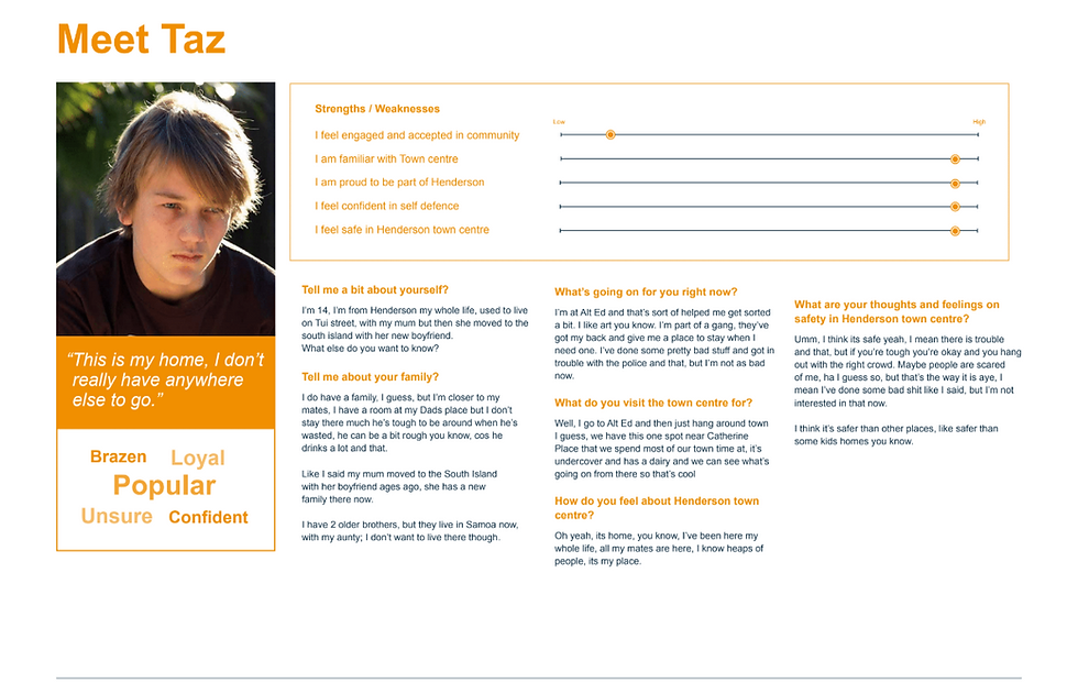 A cross disciplinary internal team was formed, based in a small studio in the town centre. As the design and capability coach I led the team through in-depth interviews in peoples homes, intercepts and observation of users in the town centre. A number of local experts were also interviewed. A picture began to emerge and our understanding deepened. Personas, user journeys and models enabled us to digest and share learnings. Factors associated with safety in Henderson Town Centre were identified and then began the process of designing potential solutions to create key strategic shifts. Full documentation of the learnings and corresponding ideas formed the Safer Henderson Town Centre Plan which was subsequently endorsed by Henderson-Massey Local Board who allocated $91,000 towards community safety initiatives.